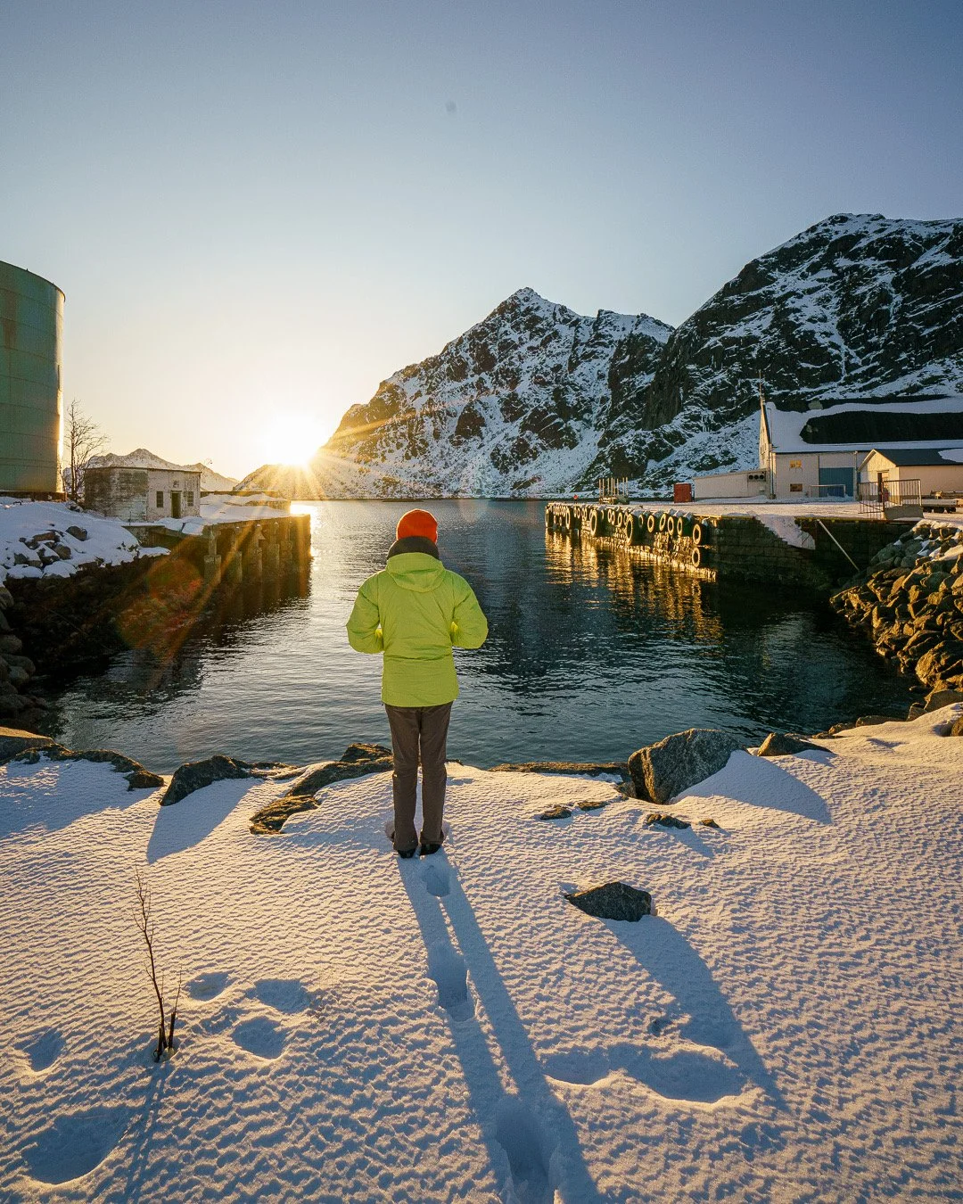 This town is located on the most southern tip of the Lofoten Islands. The road literally ends here! There is a small hike past the parking that takes you to an open area with cliffs. From here you can see the open ocean to the south. Knee deep snow, it was fun to walk around and take in the views.