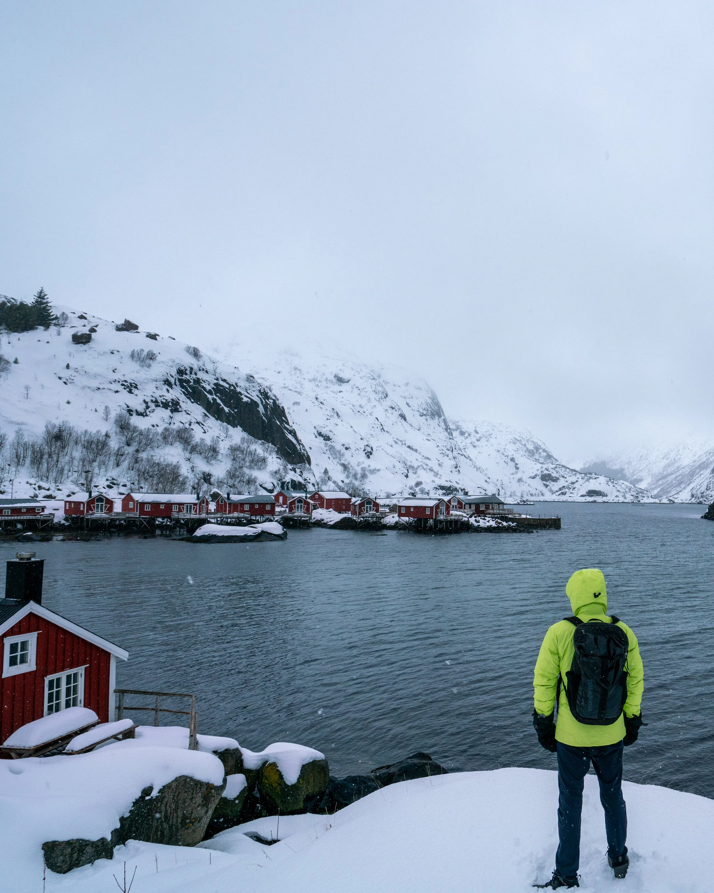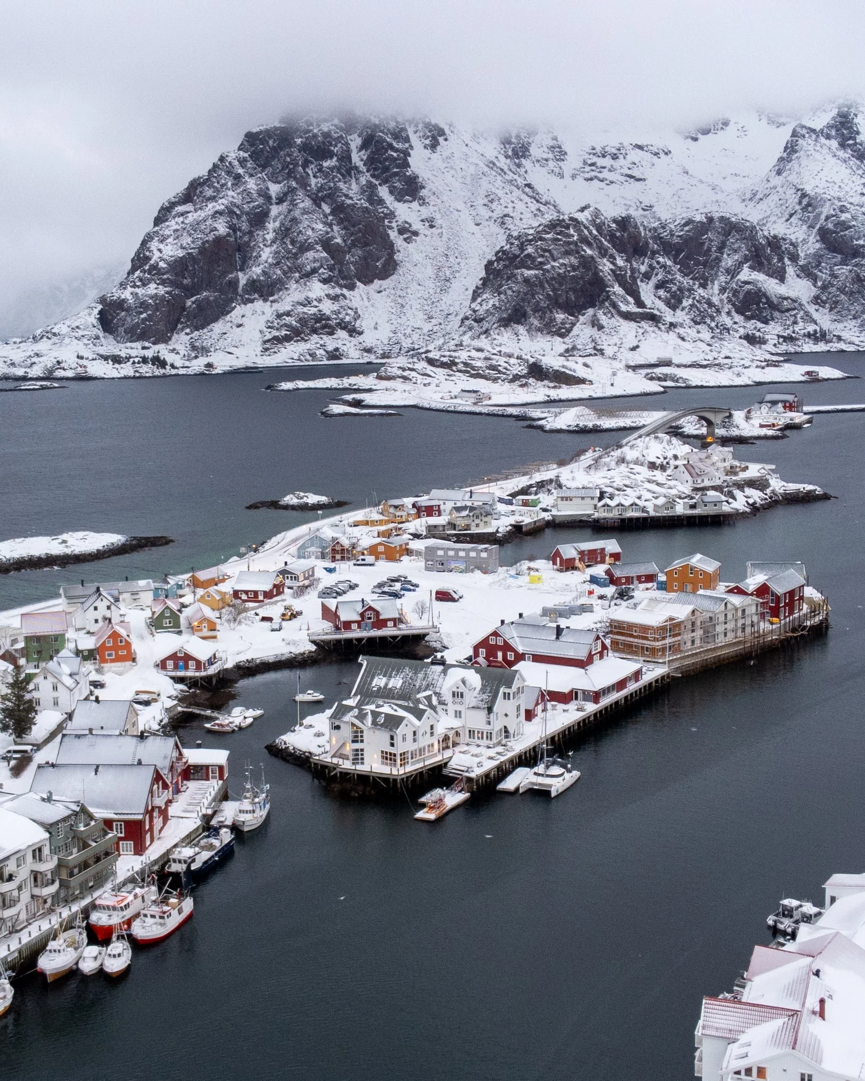 Nusfjord is a small village. It is a very cute area perched against the seaside. There are a number of small shops, vintage cafes, and galleries. The village is superb for photos. A snow storm rolled in when we visited, but we were able to make the best of our time there! This is a great place to stop for lunch on your drive to Reine.