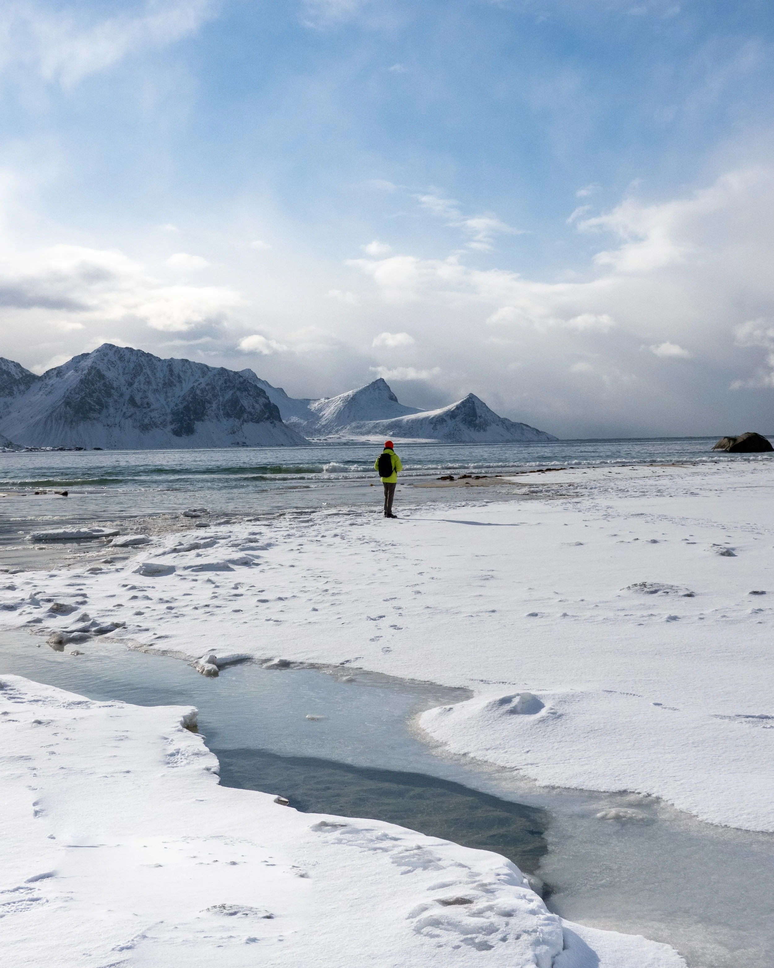 This wide beach was located right off the road E10 on the way into Reine. It is absolutely worth a stop. It was stunning to see the snow covering the beach. The beach is also very popular for surfing. You can check out the Lofoten Beach Camp Surf. They have a very pretty station next to the beach.